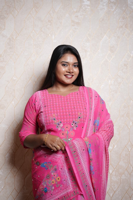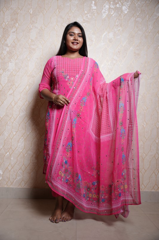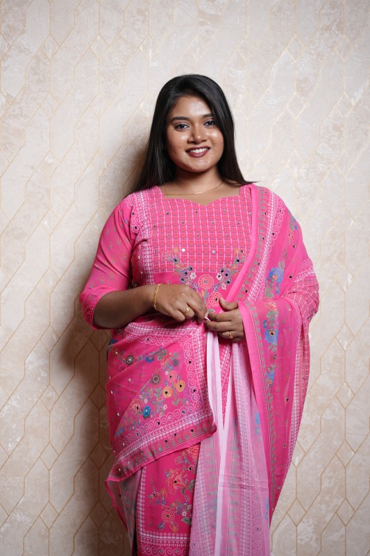 Embrace elegance and comfort with this charming bright pink cotton kurti set. Designed with delicate floral prints and mirror work detailing, this outfit radiates festive charm. The matching dupatta features a coordinated floral and geometric print border that enhances the overall grace of the ensemble.