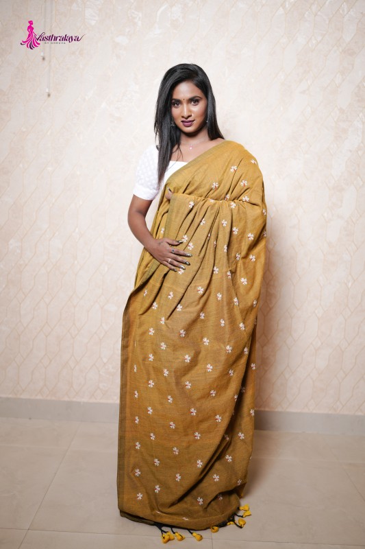 Elevate your ethnic charm with this mustard yellow handwoven saree, beautifully adorned with delicate floral thread embroidery. The soft texture and subtle sheen make it a perfect blend of comfort and elegance. Its minimal yet graceful design makes it versatile for festive occasions, casual gatherings, or office wear.