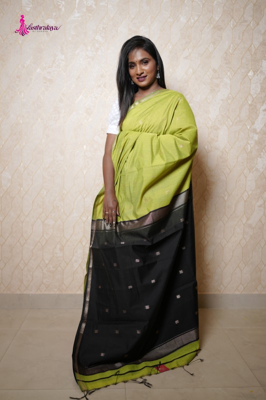 Grace your wardrobe with this elegant Maheshwari Silk Cotton Saree in a refreshing lime green shade, beautifully paired with a striking black border. The saree is adorned with delicate woven motifs, adding subtle charm and sophistication to its appeal. The soft silk-cotton blend ensures lightweight comfort, while the lustrous texture gives it a refined, festive look.