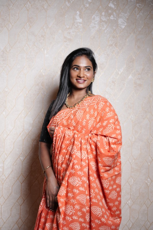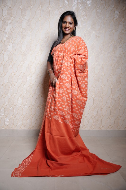 Everyday elegance with this Mul Mul cotton saree in a vibrant rust orange hue. The saree features delicate white floral block prints spread across the drape, giving it a fresh and timeless charm. The soft mul mul cotton fabric ensures lightweight comfort, perfect for long wear, while the simple border adds a graceful finishing touch.