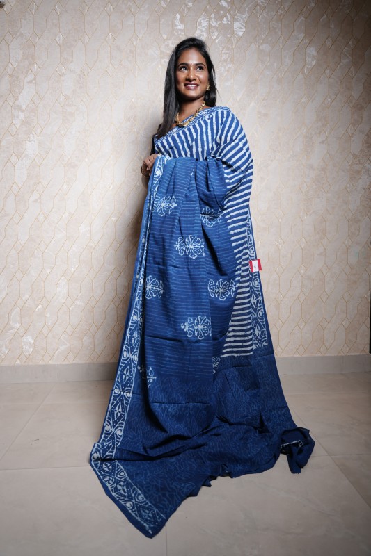 The saree is dyed in a mesmerising Natural Indigo—a deep, vibrant blue that is a timeless staple in Indian textiles. The white prints, likely created using the Dabu (mud-resist) or other block-printing techniques, stand out beautifully against the rich blue base.