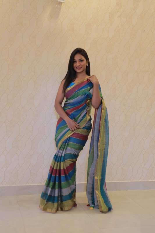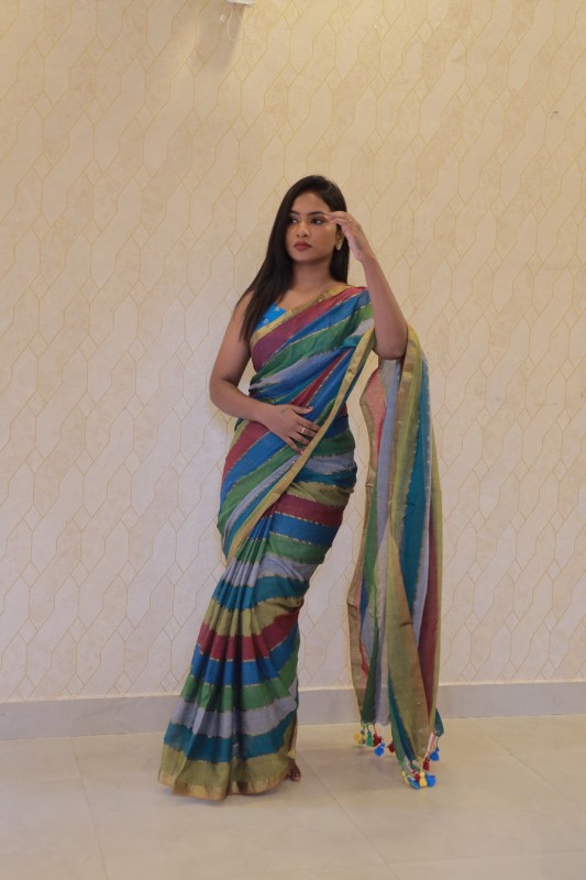 This stunning multi-colour mulmul cotton saree. Crafted from soft, breathable mulmul (muslin) cotton, this saree offers unmatched comfort and effortless elegance. The vibrant blend of hues — including blue, green, red, and gold — creates a beautiful striped pattern that is perfect for both casual and festive occasions.
