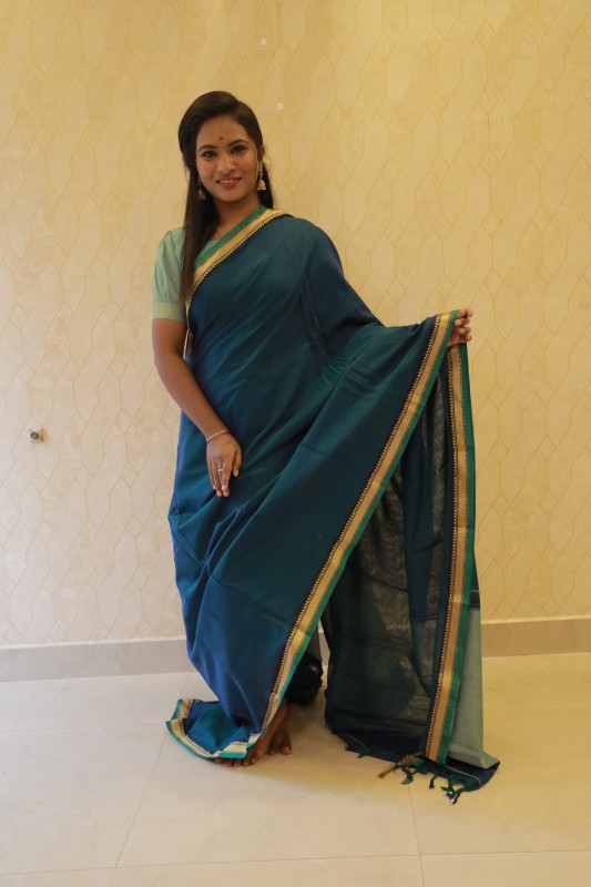 Elevate your everyday elegance with this exquisite Narayanpet pure cotton saree, woven to perfection in a rich deep teal hue. Accentuated with a refined gold zari border and subtle contrast edging, this saree reflects the timeless charm of traditional Narayanpet handloom craftsmanship.