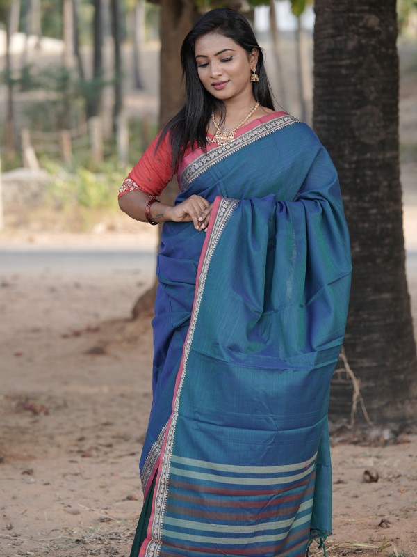 This elegant Narayanpet cotton saree comes in a beautiful dual-tone blue shade with a classic contrast red border. The traditional zari woven border and striped pallu add a graceful ethnic touch. Made from soft, breathable cotton, it is perfect for daily wear and small occasions.