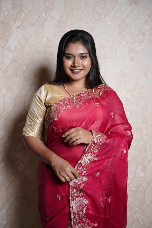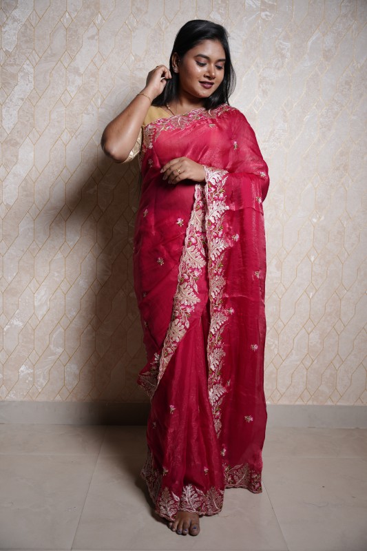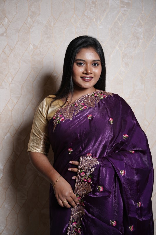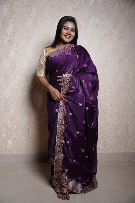 Elevate your festive and special-occasion wardrobe with this stunning deep purple organza saree, designed to make you shine with effortless elegance. Crafted from lightweight, sheer organza, this saree drapes beautifully and features delicate floral thread embroidery scattered across the body for a refined, graceful look.