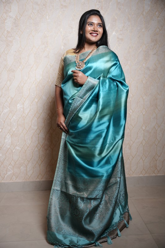 *  High-lustre, dual-tone Art Silk fabric; rich, textured finish; grand, woven pallu and border; tassel detailing on the pallu.