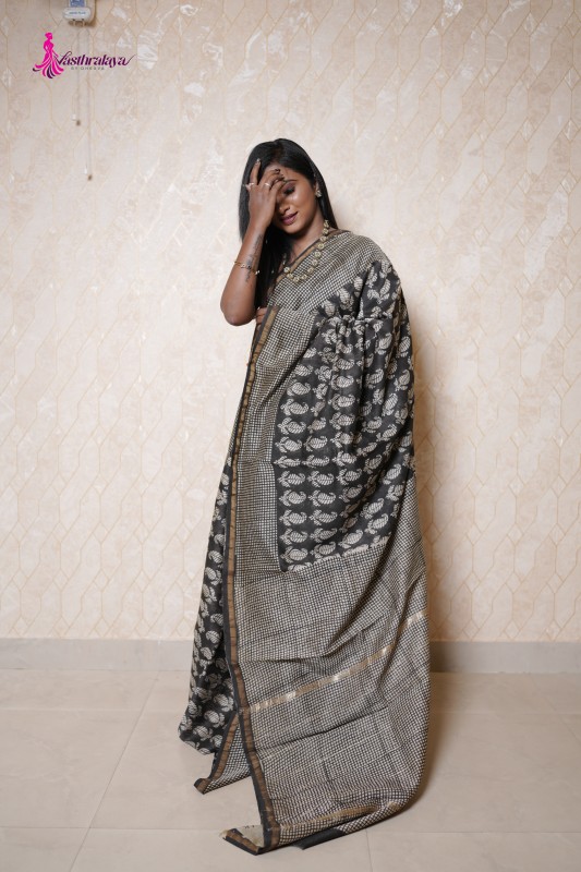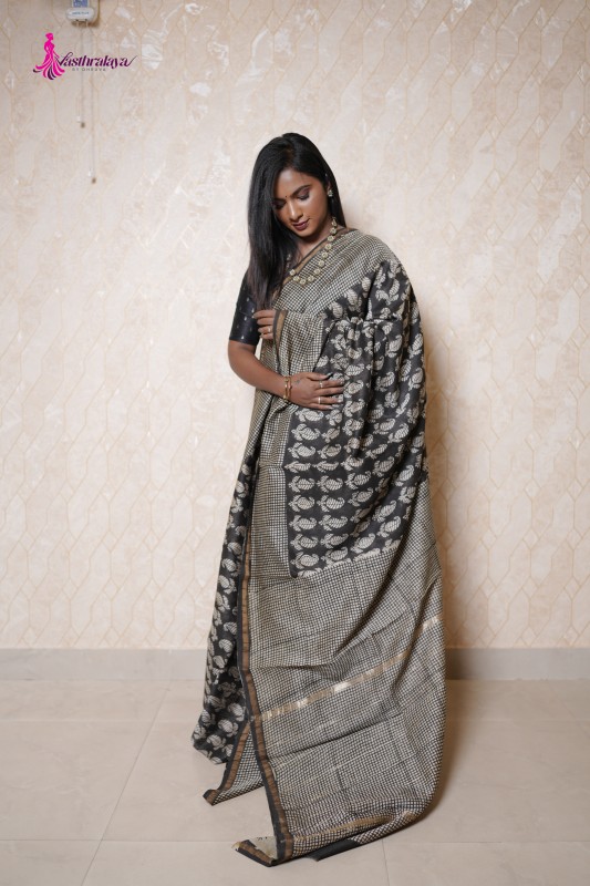 Design: Contrast of geometric checks with bold leaf motifs on the pallu