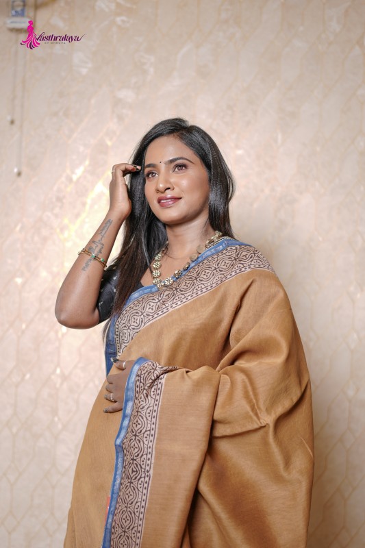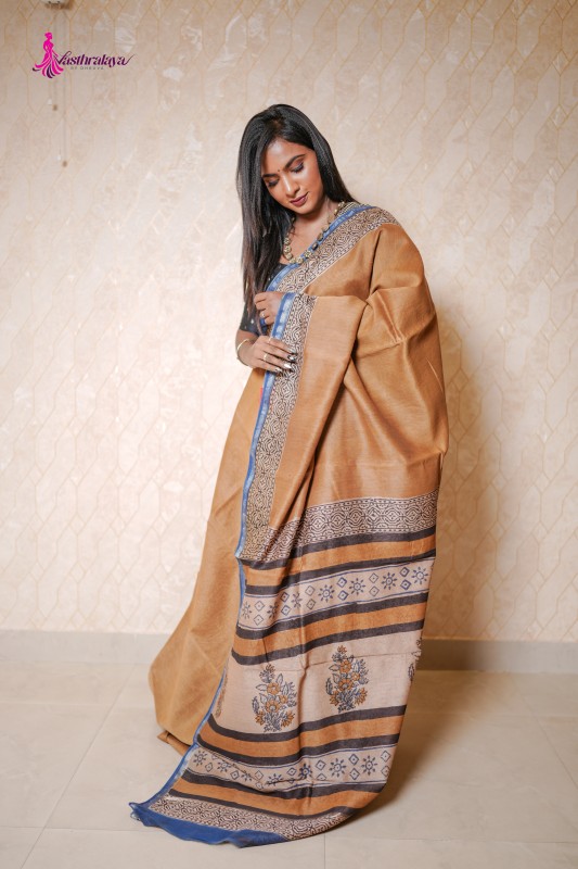 elegant handloom saree in warm golden brown with blue accents. The saree features a sophisticated woven border with intricate geometric motifs and a striking contrast blue edging. The pallu is adorned with traditional floral and striped patterns in earthy tones, making it perfect for both festive occasions and formal gatherings.