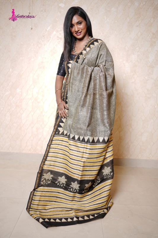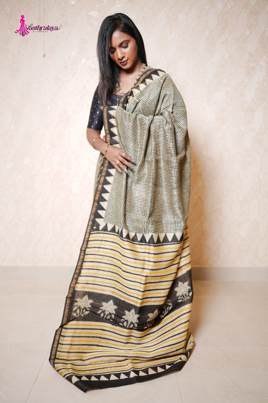 Step into elegance with this exquisite handloom cotton saree that beautifully blends tradition with modern charm. The saree features a classic black and beige color palette highlighted with geometric and floral motifs along the border. The body is adorned with striking mustard and black stripes, while the pallu showcases a subtle checked pattern, adding a sophisticated contrast.