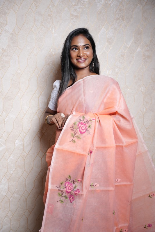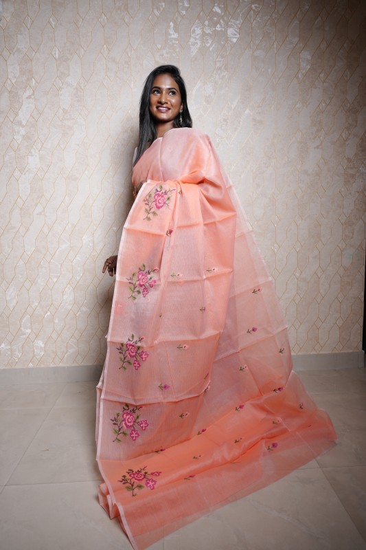The gentle Apricot/Soft Coral hue provides a beautiful, luminous base for the exquisite, hand-embroidered floral motifs scattered across the body and pallu. The charming pink and green threadwork adds a touch of feminine grace, contrasting beautifully with the sheer texture. This saree is the definition of understated elegance and sophistication.