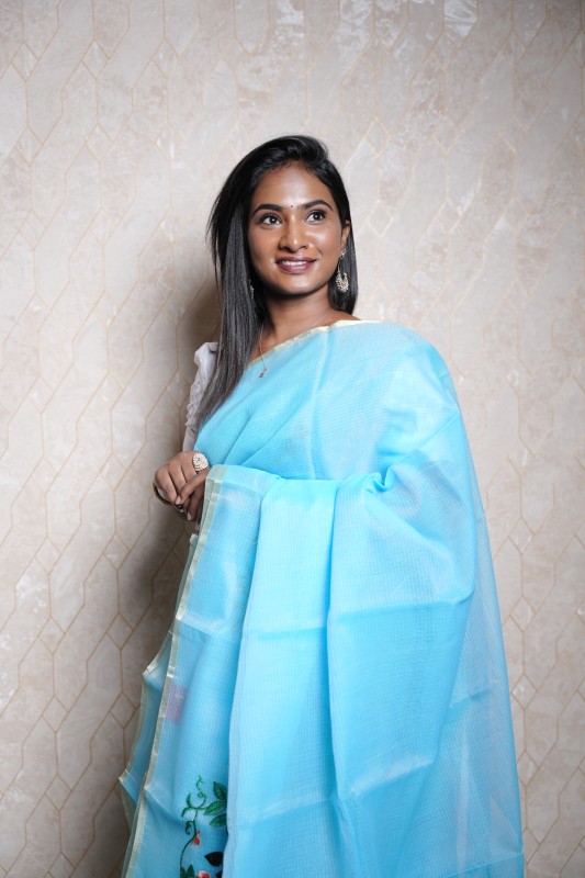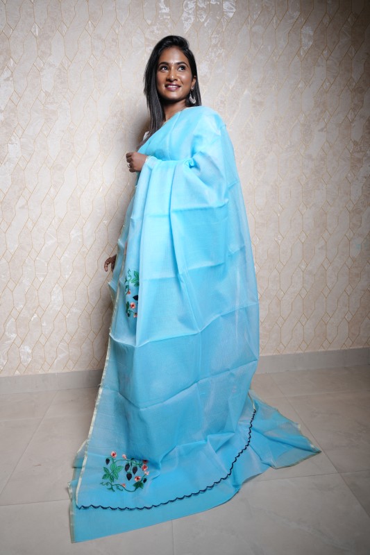 This saree showcases delicate thread embroidery that adds a subtle charm without overwhelming the elegance of the weave. The soft cotton-silk blend offers a gentle drape and natural sheen, making it ideal for day-long comfort.