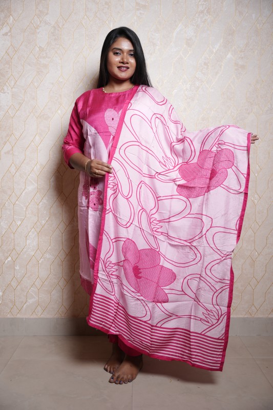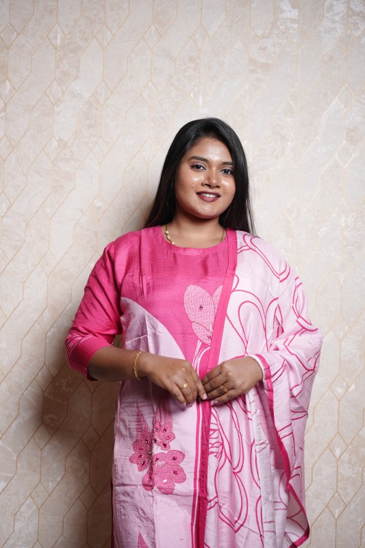 This charming pink kurthi set, designed to bring out your graceful style. The kurthi features a simple yet classy design with delicate embroidery accents, paired with a matching bottom for a complete look. The highlight of this set is the lightweight dupatta adorned with bold floral prints in shades of pink and white, adding a vibrant and contemporary touch. Perfect for casual outings, festive occasions, or day-to-day ethnic wear, this ensemble blends comfort with sophistication.