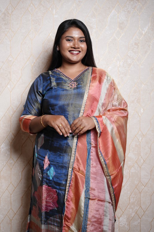 This stunning navy blue silk kurthi paired with a beautifully printed dupatta. The kurthi features a rich silk texture with subtle printed floral accents and a delicate embroidered neckline for a graceful finish. The contrasting peach-hued dupatta showcases artistic abstract and floral patterns, highlighted with shimmer tones and a zari-style border for a festive charm.