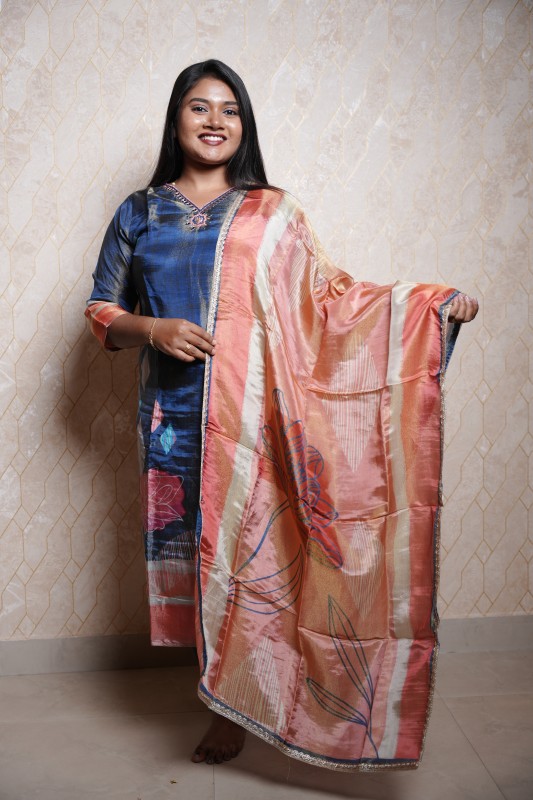 • Color: Navy blue kurthi with peach and gold printed dupatta