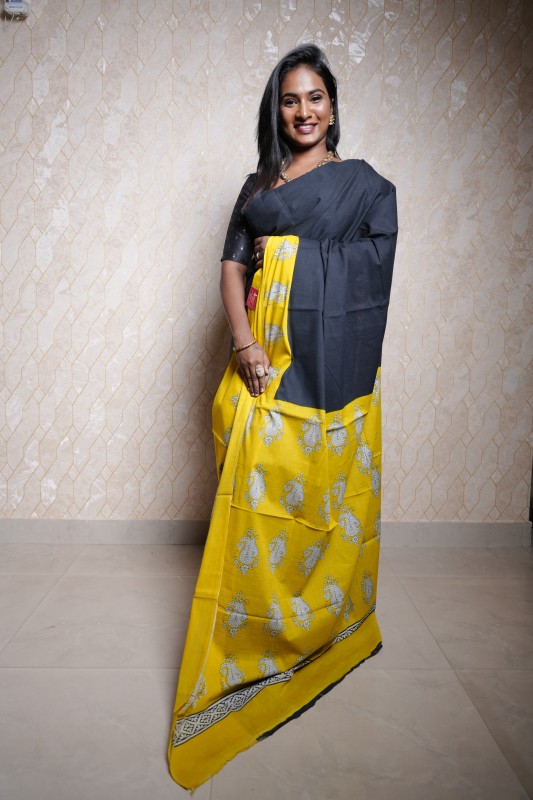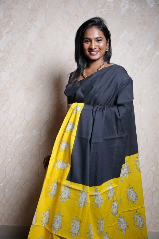 The saree features a bold dual-tone design with a solid black pallu and blouse portion, beautifully contrasted by a vibrant yellow drape adorned with silver paisley motifs. The subtle black woven border adds a refined touch to the overall look.