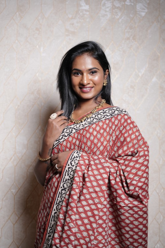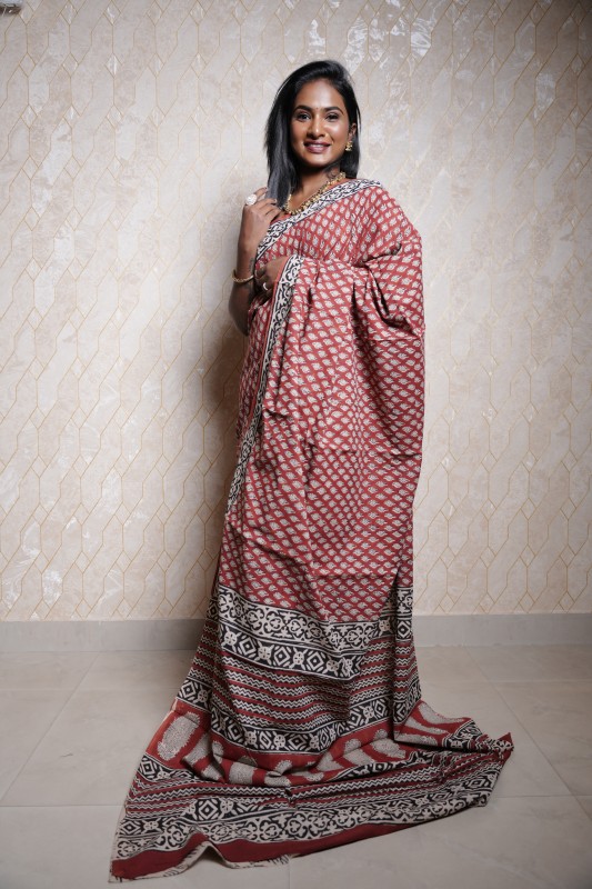 The design features exquisite traditional block printing, likely a Dabu or Bagru style print, showcasing the skill of generational artisans. The primary colour is a rich, earthy Red or Rust, contrasted beautifully with Cream/Beige and Black motifs. The body of the saree is adorned with a delicate, repeating geometric or floral pattern, while the pallu and border are framed by bold, contrasting geometric and zig-zag designs.