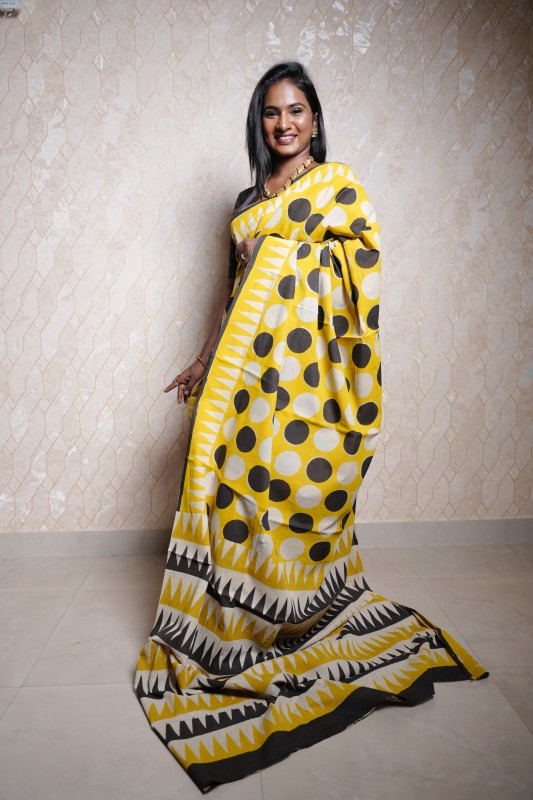 This stunning Mul Mul Cotton Saree in a striking yellow base with bold black and white polka dot patterns. The saree is highlighted with an eye-catching geometric zig-zag border and pallu, giving it a perfect fusion of traditional and contemporary design. Crafted in lightweight mul mul cotton, it drapes beautifully and ensures all-day comfort, making it ideal for festive gatherings, casual outings, or office wear.