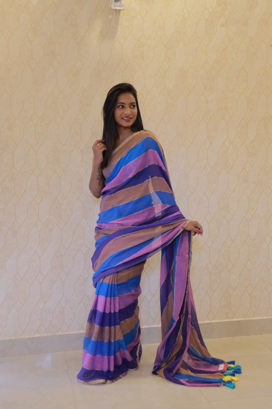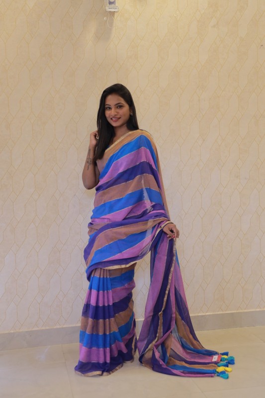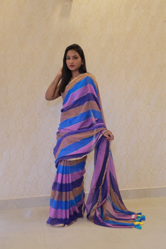 Add a touch of charm to your wardrobe with this beautiful Multicolour mul cotton saree. Featuring vibrant stripes of blue, purple, pink, and earthy brown, this saree is a perfect blend of comfort and elegance. Crafted from soft, breathable mul cotton, it drapes effortlessly and feels light on the skin—ideal for everyday wear or casual gatherings. The playful tassels at the pallu add a fun, youthful touch.