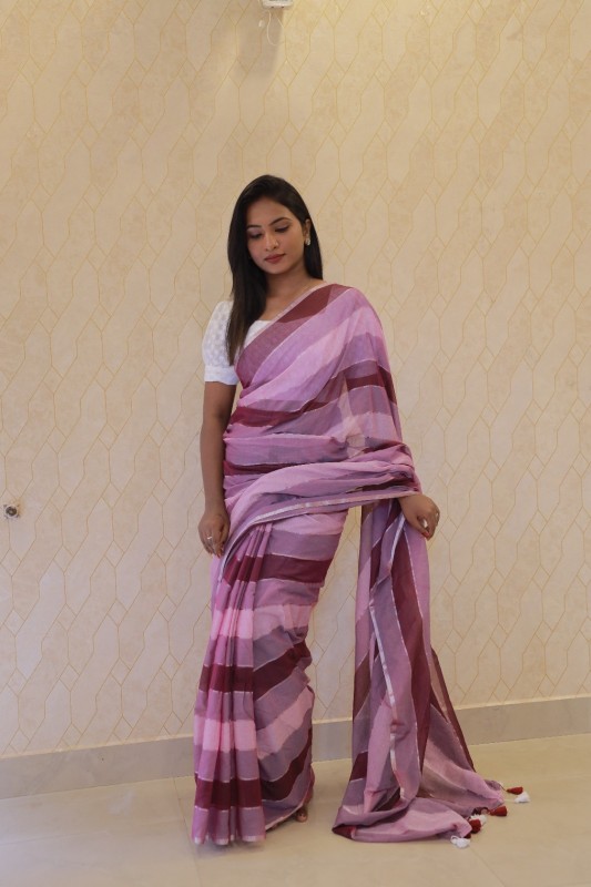Elevate your everyday elegance with this beautiful Multi-colour mul cotton saree. Crafted from soft and breathable mul cotton, this saree features soothing shades of pink, mauve, and maroon arranged in bold stripes that add a contemporary touch to its traditional charm. The lightweight fabric drapes gracefully, ensuring all-day comfort and effortless style.