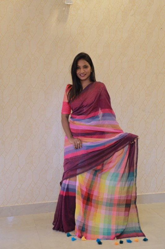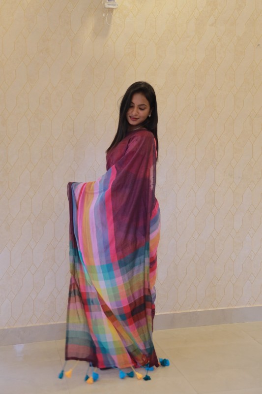 The deep wine tone of the body contrasts beautifully with the vibrant rainbow checks on the pallu, creating a perfect blend of sophistication and cheer. Finished with playful tassels along the edge, this saree is ideal for brunches, festive gatherings, or casual get-togethers.